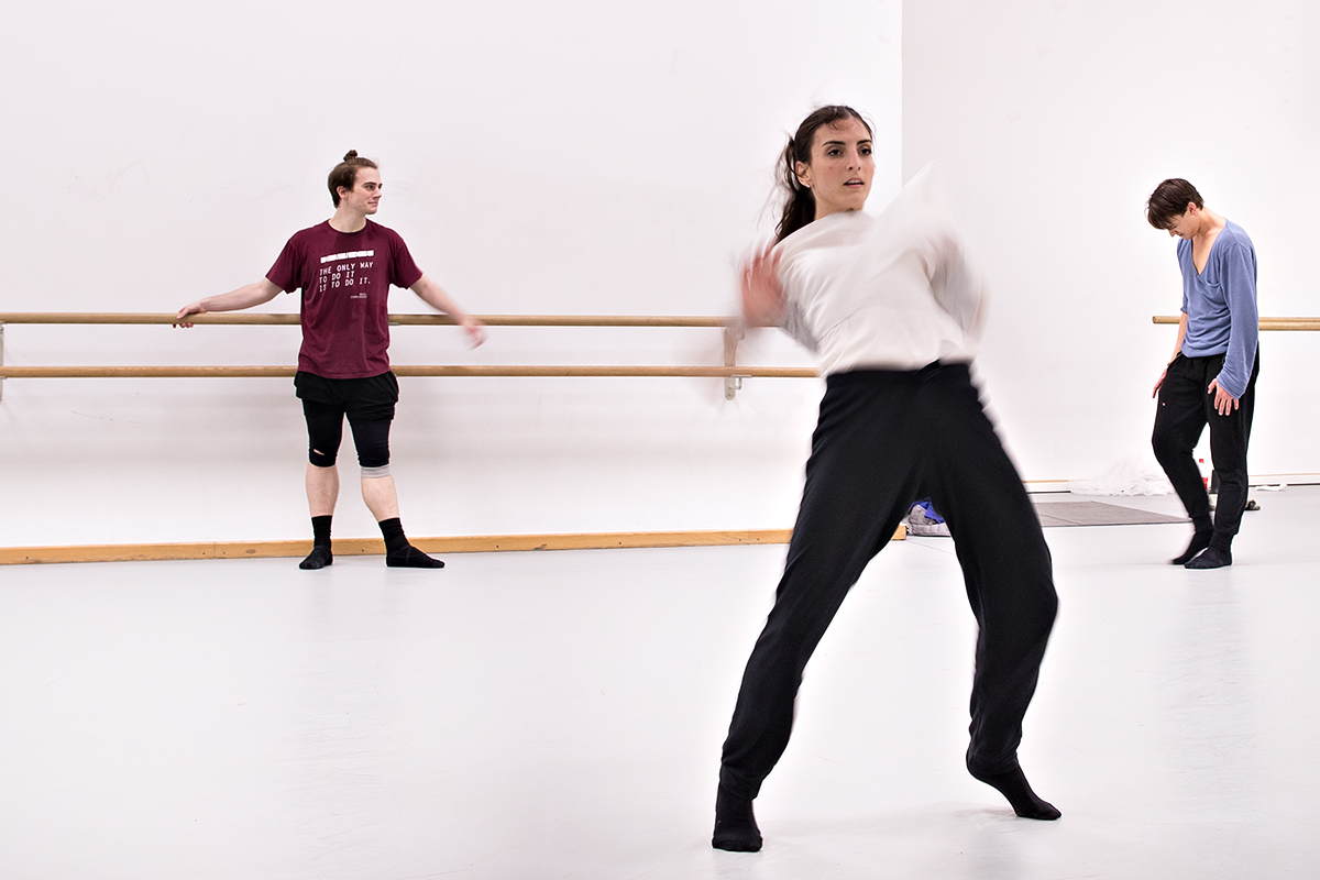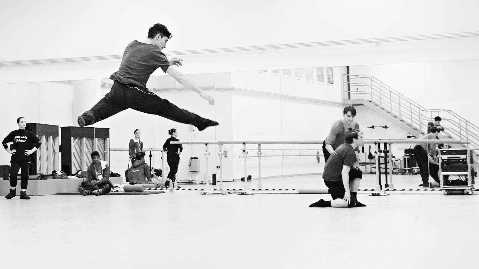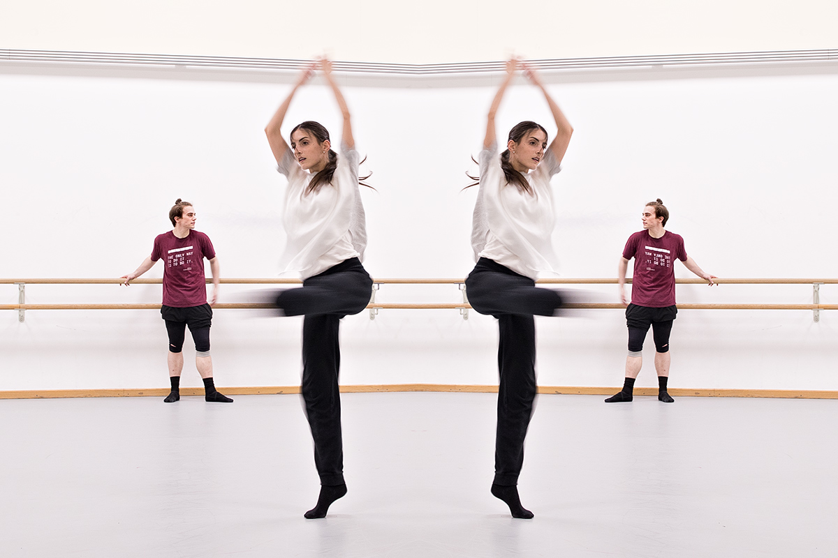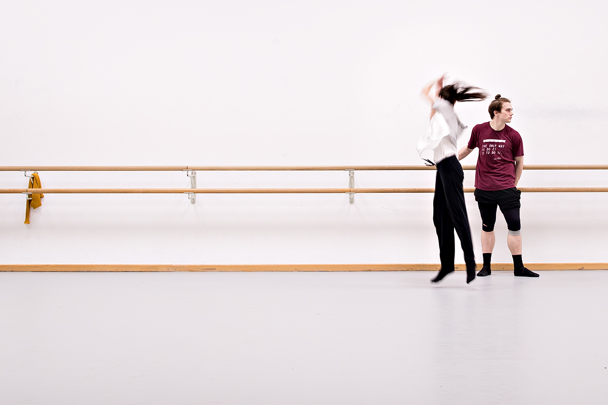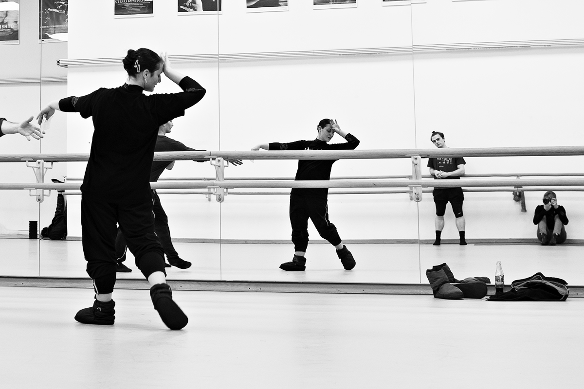 Viele dieser Fotos aus dem Probensaal des Aalto Ballets haben also ganz gegen meinen Plan ihre Farbe behalten, weil der gelbe Pulli für mich formal einfach zu spannend ist. Er ist das Gegengewicht. Er ist die Verbindung zwischen dem linken und dem rechten Bildrand. Er überbrückt den Weißraum. Ohne ihn würden die Fotos kippen, denn die Tänzer am rechten Bildrand hätten nichts, was ihnen die Waage hielte.