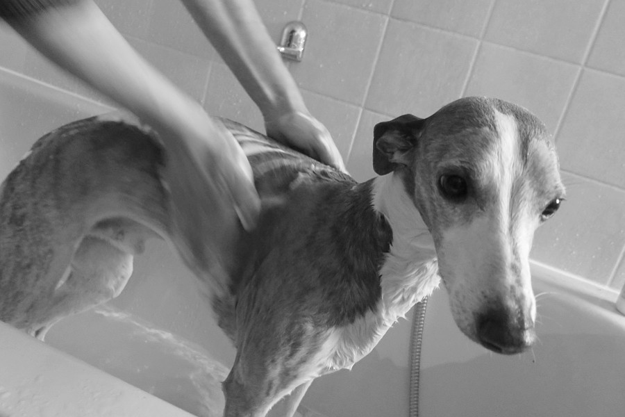 Dennoch halte ich nichts davon, Hunde ständig auf Hochglanz zu polieren. Es sind Hunde. Sie rennen über Wiesen, buddeln, toben, werden nass. Der gröbste Dreck ist schnell herausgebürstet. Den Rest erledigt ein dickes Handtuch. Das Rubbeln genießen sie übrigens sehr. Ich muss allerdings zugeben, dass ich oft froh darüber bin, mich für eine kurzhaarige Rasse entschieden zu haben. Nicht vorzustellen, müsste ich einen Afghanen baden. Himmel….!