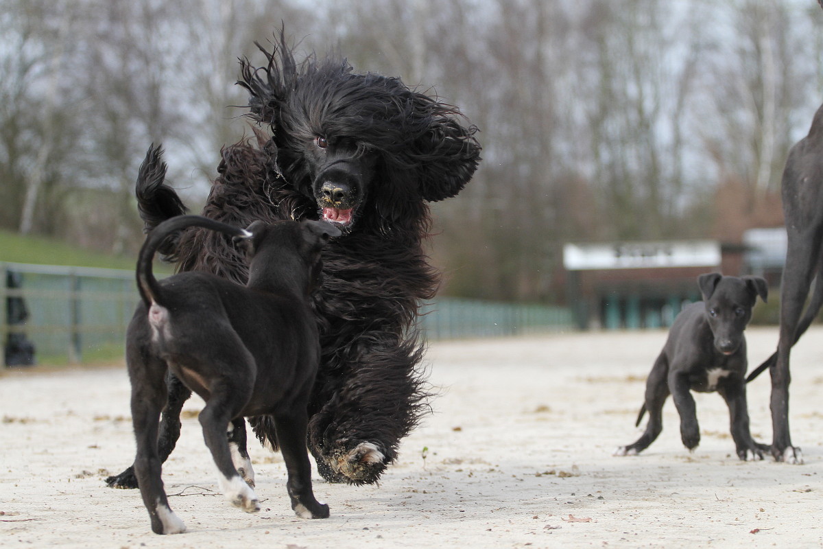 Fast ein Feiertag ist es dann natürlich, wenn ich gleich sieben Welpen, ihre Mutter und die ebenso rabenschwarze Portugiesische Wasserhündin Sina vor der Kamera habe. Dann muss ich mich nur noch auf die Wiese legen und kann die Show genießen. Die Kleinen haben so viel Power und Lebensfreude, dass mir Mutter Freaky fast leid getan hat. Diese Engelsgeduld hätte ich auch gerne.