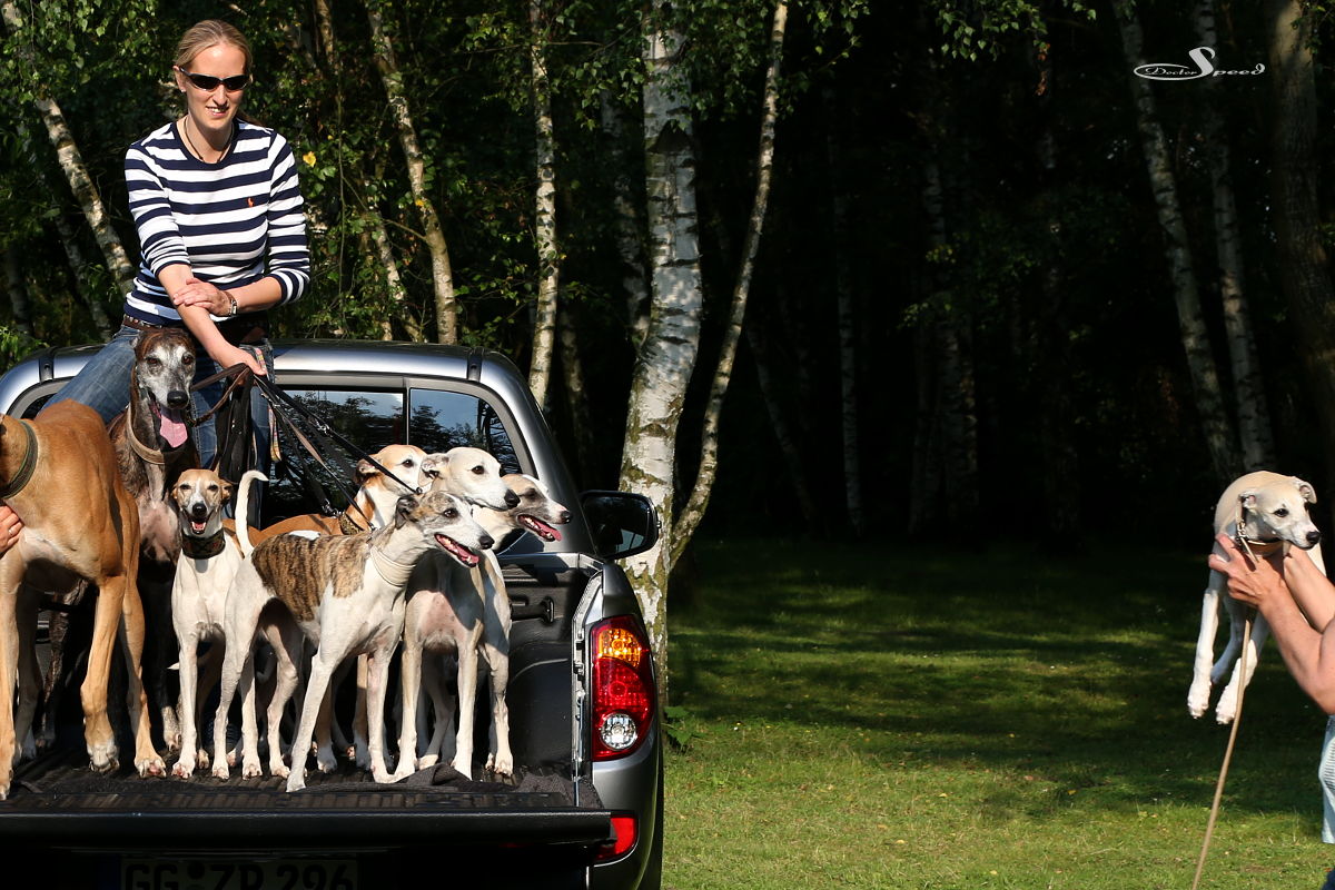In die Lücken zwischen den Greyhounds konnten wir dann munter die Whippets stopfen. Sieben ließen sich noch problemlos stellen. Es hätten auch mehr gepasst, aber einige der Damen fühlten unwohl in der Enge zwischen den Rüden. Also wieder runter mit ihnen. Babs blieb oben und hielt wie damals Ben Hur wacker die Leinen, um Ruhe in das Gespann zu bringen. Super!