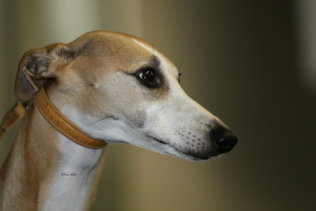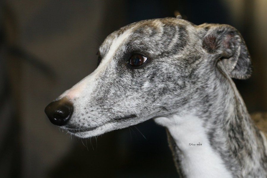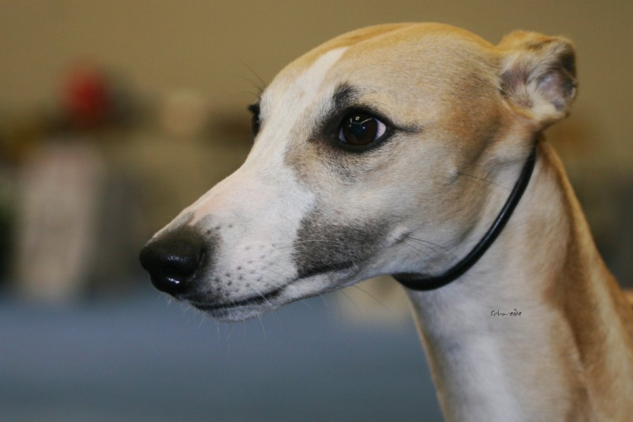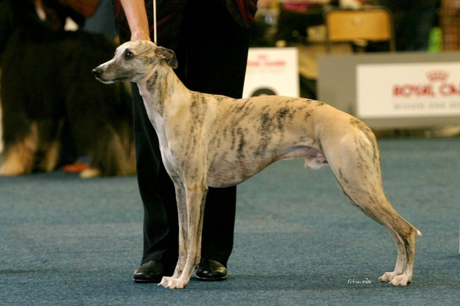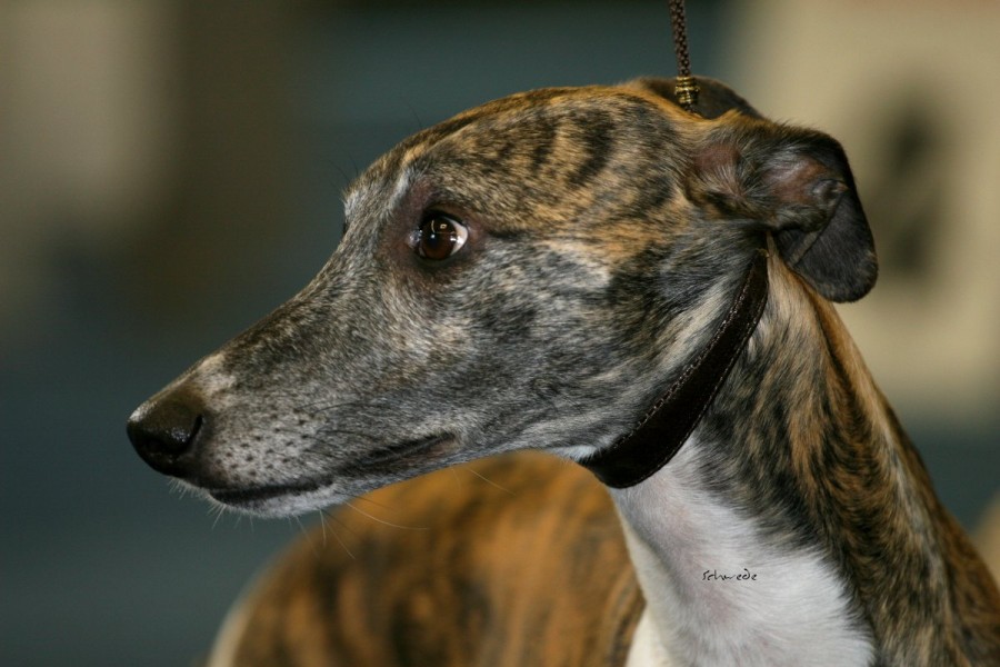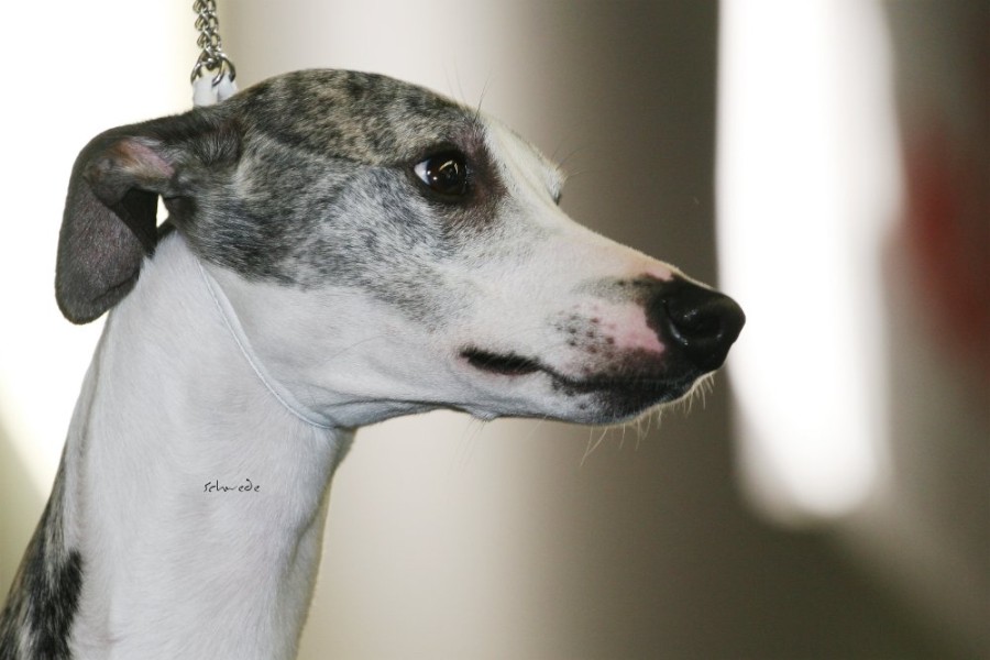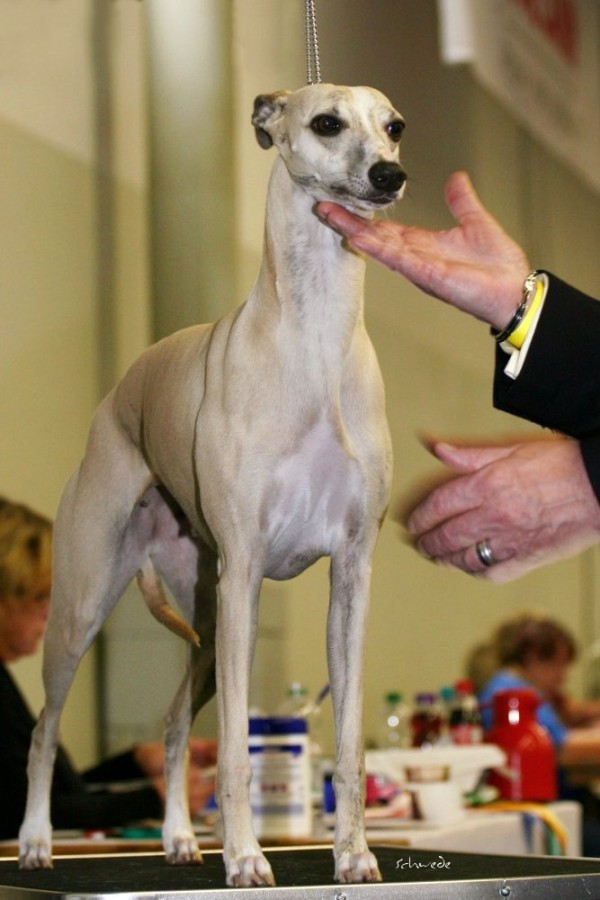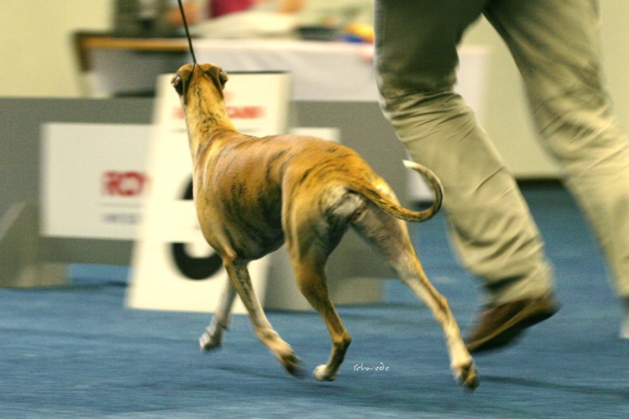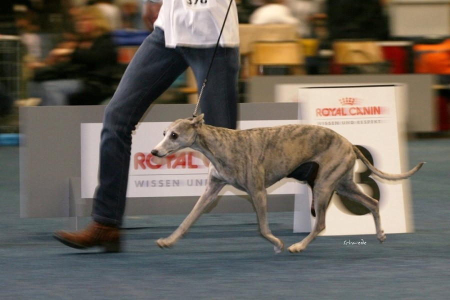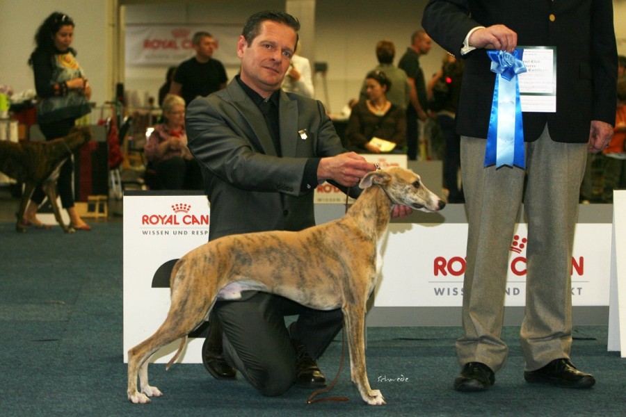 Die anwesenden Hunde waren allerdings die Sahnehäubchen der Szene. Hello World Di Mahana müsste mittlerweile jedem, der auch nur ansatzweise mit Whippets zu tun hat, ein Begriff sein, ebenso wie die Weltjugendsiegerin 2011 Ch.Adagio Move Your Mind, ihr Bruder Adagio Crowdstopper und die Mutter der beiden Ch. Adagio Captured Sunshine. Über den Richter Roger Stock muss man wohl genauso wenig sagen – Courthill Whippets, Großbritannien, Koryphäe, Urgestein. Er brachte Disziplin und ein wenig Grandezza in den wie erwartet zu kleinen Ring. Er richtete zügig und mit scharfem Auge. Ganz im Gegensatz zu beiden britischen Richterinnen der Jahresausstellung war ihm die Größe der Hunde relativ schnuppe, das wurde sehr schnell klar. Aber auf das Gangwerk schaute er u.A. sehr genau. Outstanding bis zum Schluss zeigte sich wieder Hello World Di Mahana. Pefekt gehandelt von Jan Willem Akerboom gewann sie nicht nur das britische CC, sondern auch das BOB und später das Best-in-Show. Ch.Adagio Crowdstopper erhielt das begehrte CC bei den Rüden. Monos Onkel Jee-Bee’s Dancing in Time gewann die Offene Klasse und erhielt neben Sobers Jade das deutsche CAC. Das Veteranen-BOB ging an unsere schicke Freundin mit dem tollen Gangwerk Ch.McKilroy Lisa Lustig.