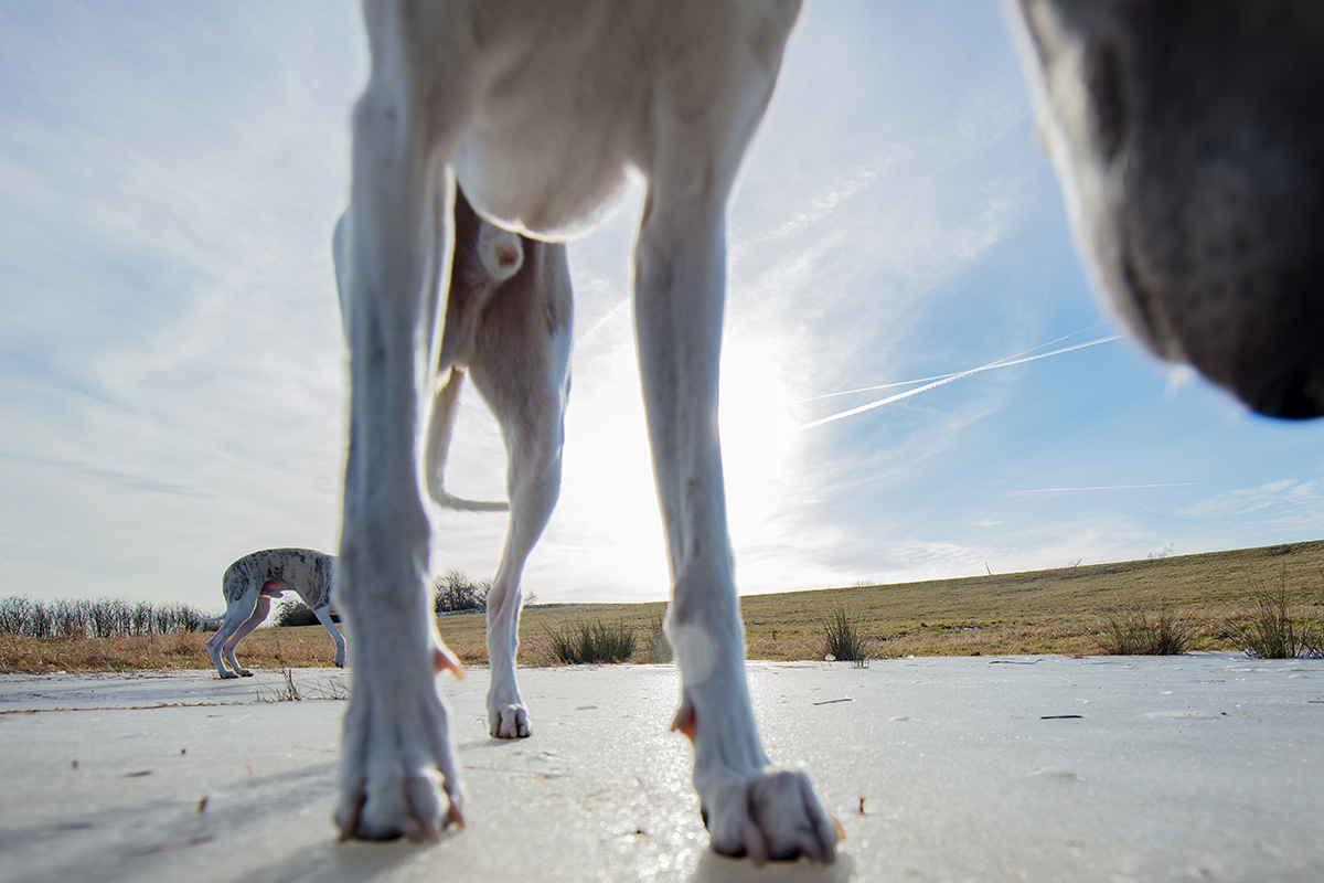 Des weiteren gilt es – wie bei allen Superweitwinkeln – zu bedenken, dass Objekte, die sich von unteren Bildrand in die Mitte bewegen, je nach Brennweite recht stark in die Länge ziehen. Diesen Effekt kann ich entweder als gestalterisches Mittel nutzen, um den Blick ins Bildinnere zu leiten oder tunlichst vermeiden. (In der Galerien unten: Mono wirkt in seinem orangen Pulli etwas sehr lang.)