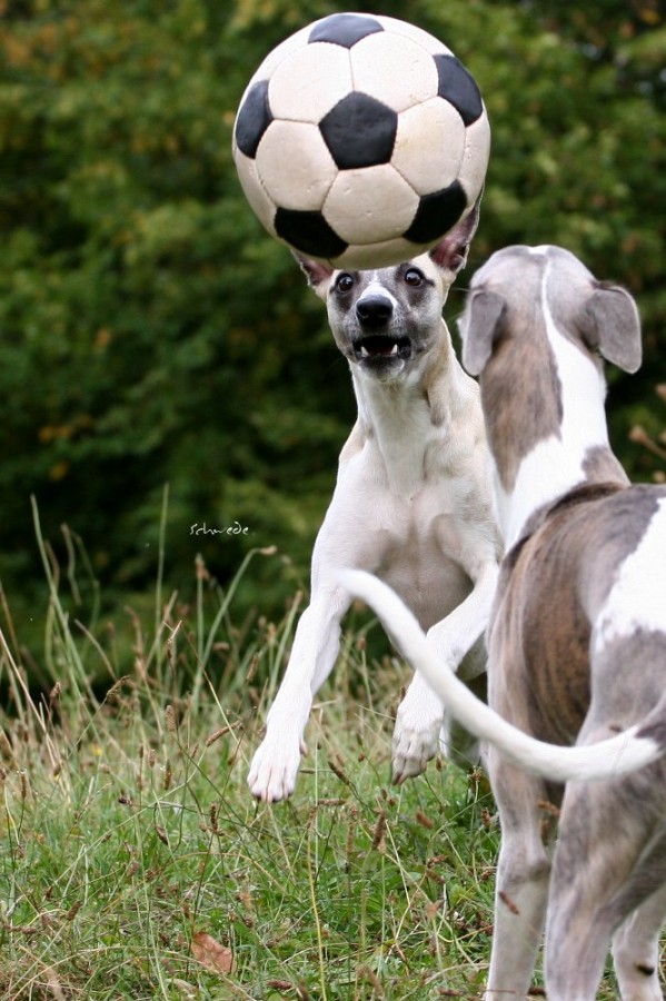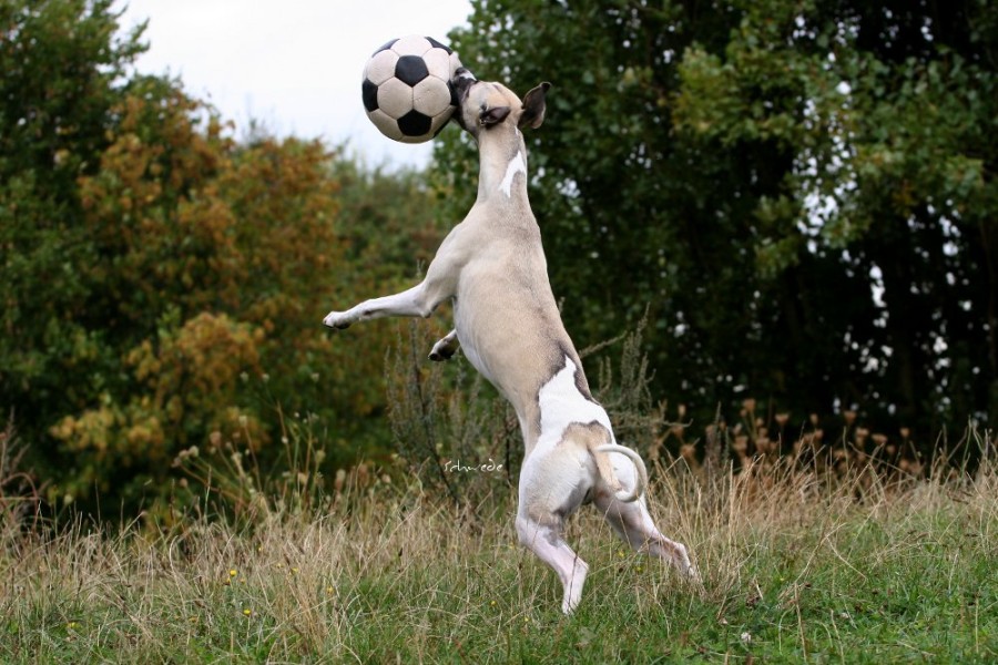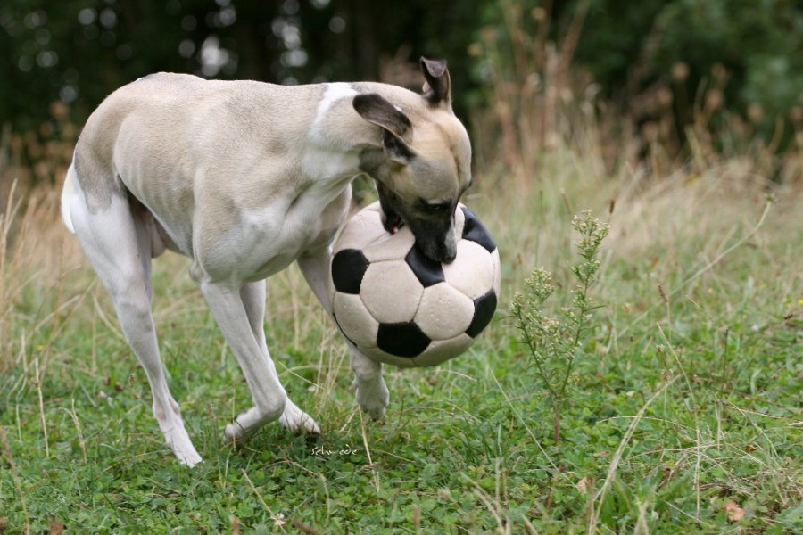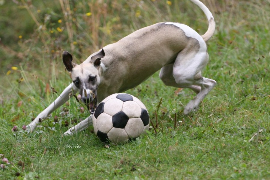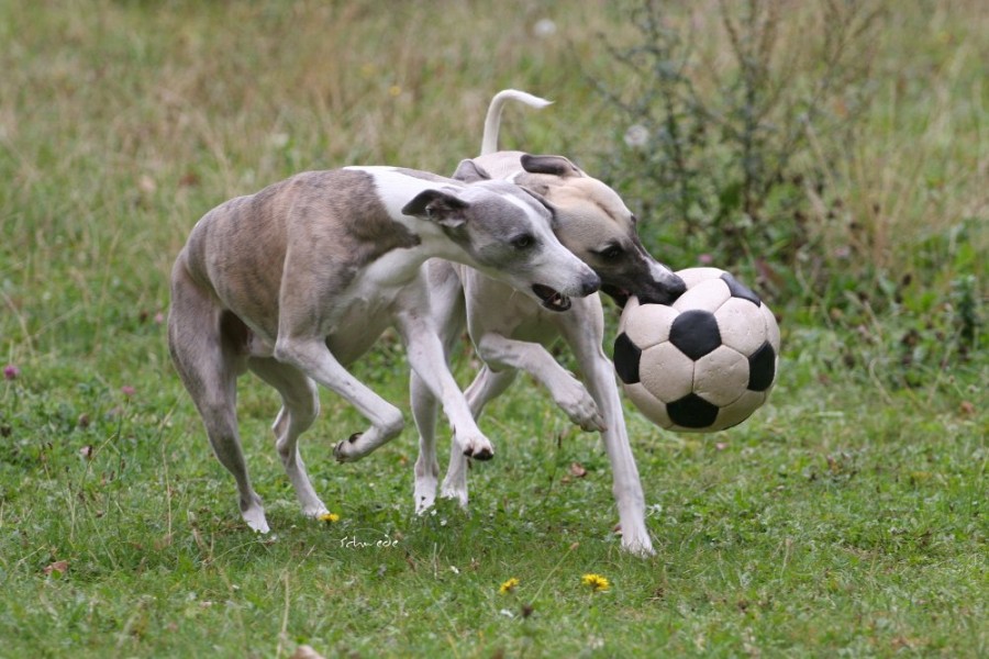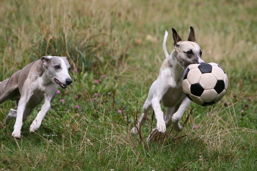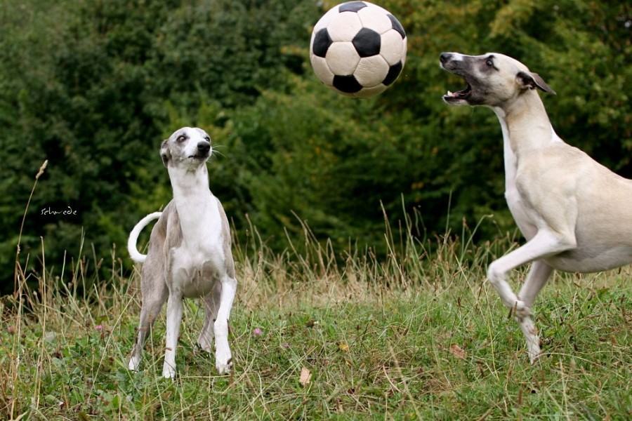 Auch wenn der Vergleich etwas hinkt – Whippets scheinen die Könige der Überschussgeschwindigkeit zu sein. Ein Frisbee fliegt recht langsam und kann elegant aus der Luft gefangen werden. Mit Bällen ist das schon etwas ganz anderes. In den seltensten Fällen nehmen Mono oder Mr.Clark sie aus der Luft oder – sehr lässig – im Vorbeilaufen vom Boden. Als wären sie nicht darauf eingestellt, dass eine Beute plötzlich stumpf liegen bleibt, donnern sie immer und immer wieder daran vorbei. Stets folgen spektakuläre Wenden und Sprünge.