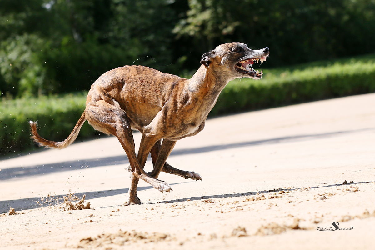 Sagt man ja immer: Versuch macht kluch! Stimmt. Aber bei meinen Versuchen komme ich immer wieder auf die beiden gleichen Punkte zurück: Mit kurzen Belichtungszeiten eingefrorene Action von z.B. Windhunden, die dem Betrachter frontal odert halbfrontal entgegen kommen, finde ich toll. Momente, in denen man die Haare fliegen und den Sabber Fäden ziehen sieht. Auf diesen Fotos werden plötzlich Details sichtbar, die mit bloßem Augen unmöglich zu sehen sind. Da staune ich immer wieder.