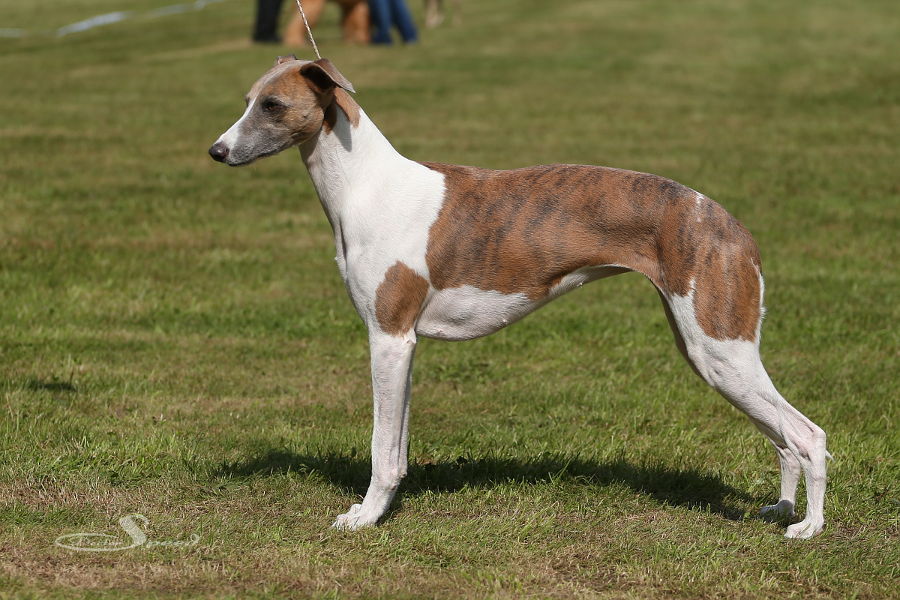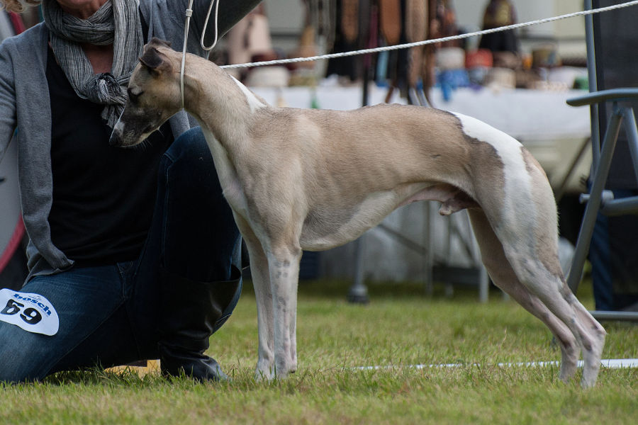 Die niederländische Richterin Frau van Veen Keur sollte am Samstag beim Duisburg-Hochdahler Windhundrennverein neben den Whippets auch die Salukis und die Sloughis richten. Die Whippetleute hatten sich also wie gewohnt in den Wartemodus begeben. Doch zum Glück, oder auch nicht, zog man die Whippets vor. Nach unserem Freund Almansors Pathfinder (Vet-BOB) war Danny also der zweite Hund, den Frau van Veen Keur an diesem Tag richtete. Ich hatte mich übrigens über die Einrichtung einer Babyklasse sehr gefreut, da sie den ganz Kleinen die Gelegenheit gibt, Ringluft zu schnuppern, wenn es noch um rein gar nichts geht.