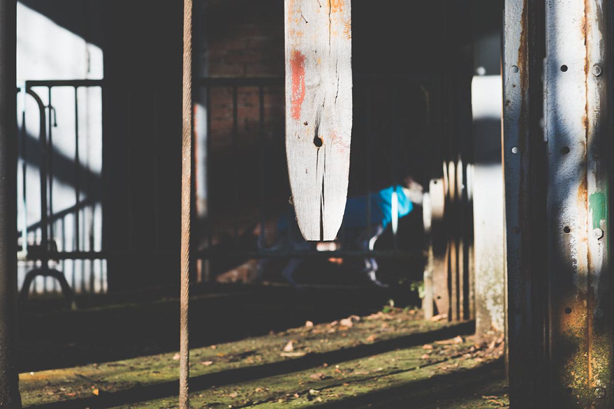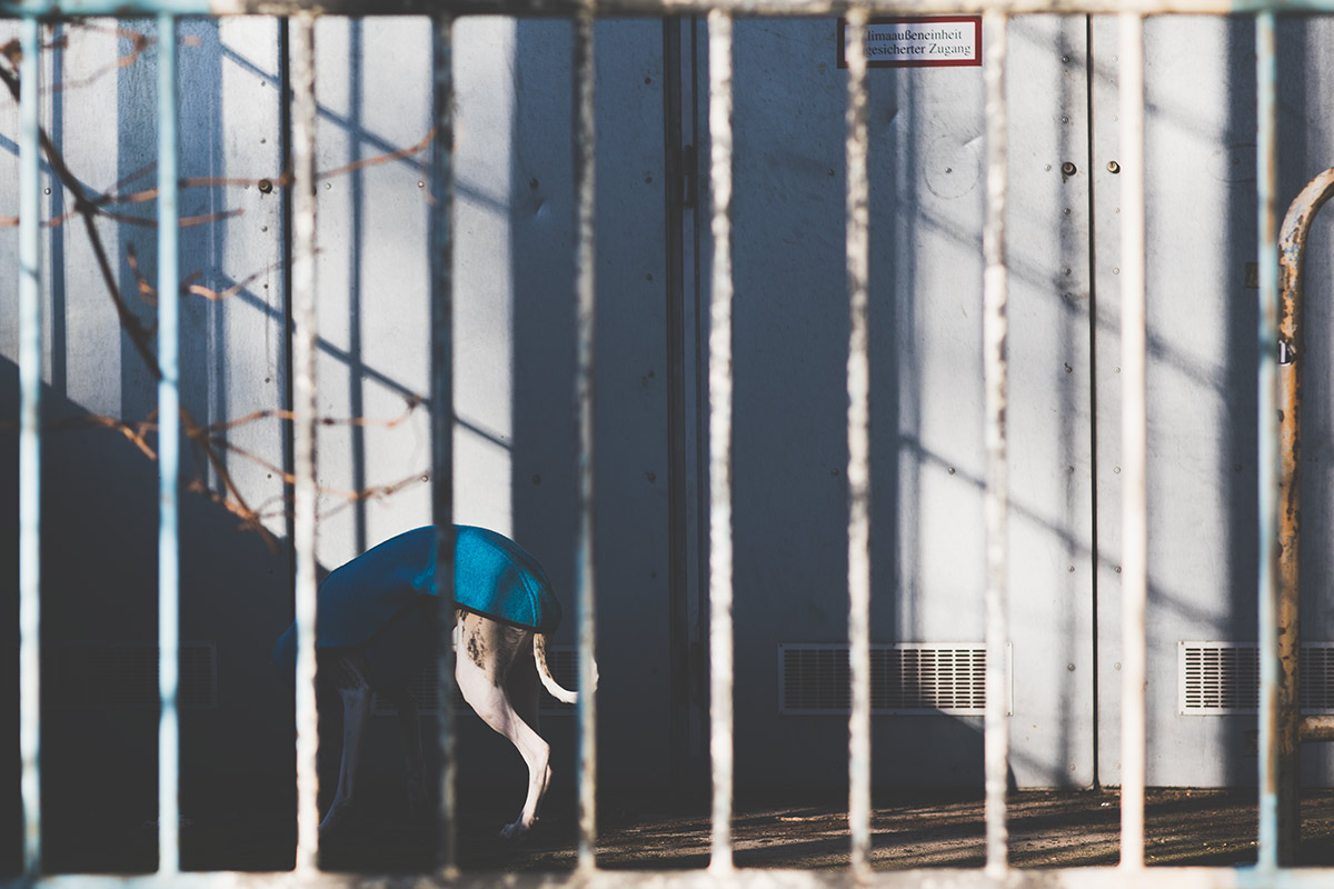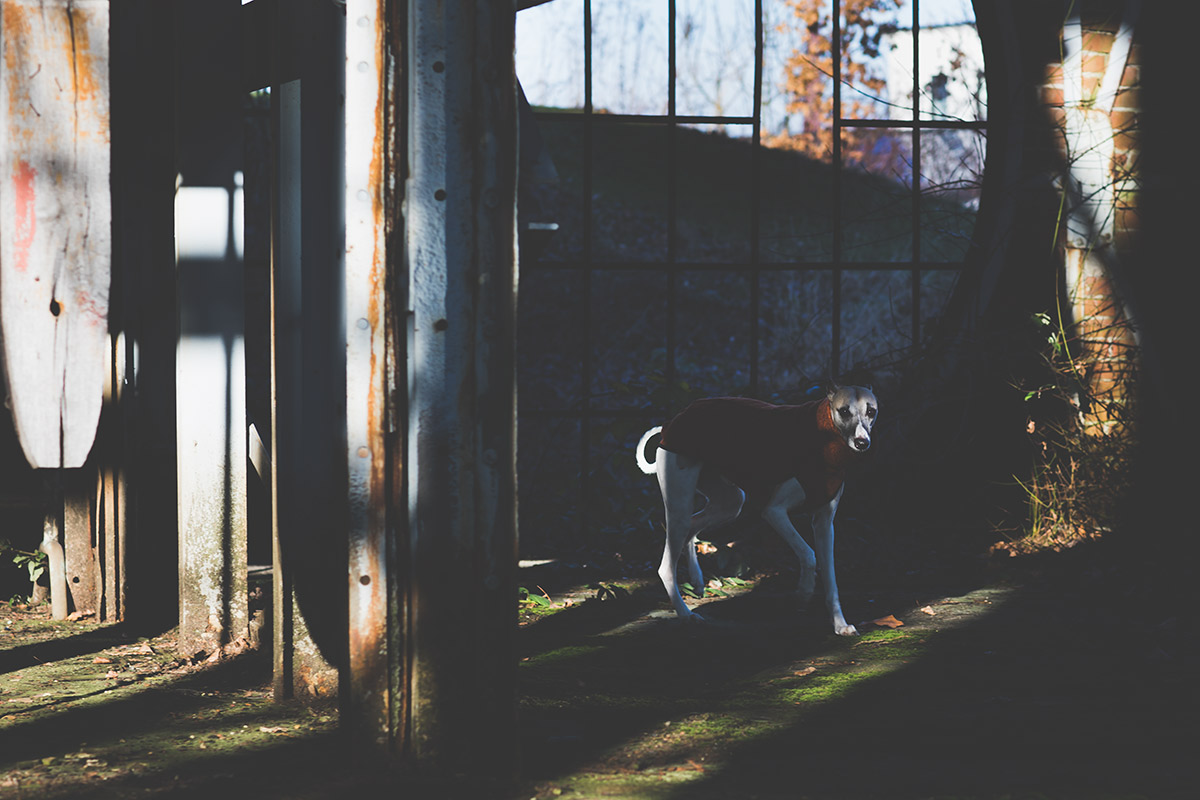 … an dem sie nicht sein dürfen, sie aber trotzdem dort sind, obwohl ich es ihnen verboten habe. Mono weiß das. Er würde dieses Gebäude niemals ohne Erlaubnis betreten. Aber Danny treibt seine unbändige Neugier. Er schawänzelt seit Monaten um einen möglichen Durchgang herum. Die schmale Nase kann sich nämlich wunderbar durch die Sprossen eine großen Fensters schlängeln, in dem einstmals ganz sicher auch Scheiben waren.