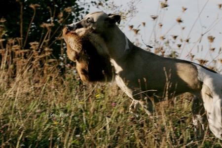 „Jaaaa, guten Tag! Das sssss …ssssin aber zwei Hü …Hübsche! Lassen sie sie ru ..huuu..ig gucken.“ Ein kleines Männlein, mit einer dicken Knollnase und freundlich blitzen Augen sprang hinter dem Hänger vor. Gerade noch hatte er gegen seine mit roten Köpfen musizierenden Kollegen angebrüllt, als plötzlich Stille eintrat. Das Männlein lachte und hob seinen Zeigefinger:“Miiii ….Miii… Mittagspause!“ Na, Gott sei dank! Mono versuchte, ein auf der Theke des Hängers hockendes Kaninchen zu erhaschen. Nein, Mono! Mr.Clark lies die Streichelattacken des Männleins stoisch über sich ergehen. „Ich haa…hab ja Dackel. Bööööse Jäger, sag ich ihnen ..!“ Er hob wieder lachend den Zeigefinger, während ich mich hektisch umschaute und die versteckte Kamera suchte. Die fand ich zwar nicht, dafür aber einen Bekannten, in Begleitung seiner Azawakh-Hündin. Die Jungs lieben sie und begrüßten sie wie immer stürmisch. Mein Begrüßung fiel weniger stürmisch aus, da ich die nun fast zehnjährige Hündin zwar schon seit fünf Jahren kenne, sie sich aber nach wie vor nicht von mir anfassen lässt.