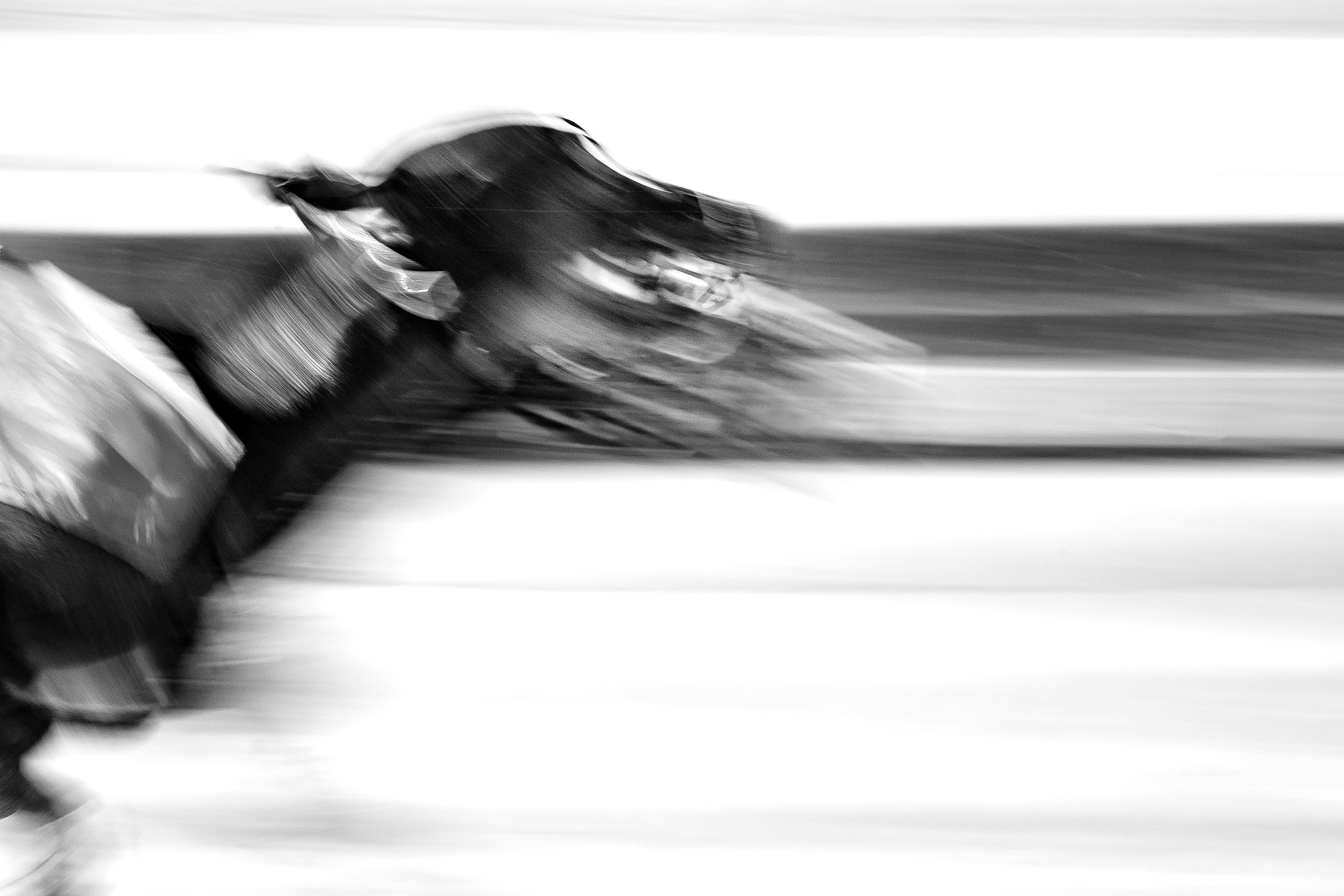 Oft bin ich planlos. Dann sitze ich vor meinem Mac und weiß nicht, was ich da eigentlich verhackstücke. Doch manchmal ist alles ganz klar. Ich will nicht eins zu eins abbilden. Wer schnelle Hunde oder schnelle Pferde sehen will, der besuche die Rennbahn oder wahlweise den Poloplatz und betrachte sie mit eigenen Augen. Ich will diese enorme Geschwindigkeit und ihre Auswirkungen zeigen. Ich stelle mir die Frage, was wir wirklich sehen, wenn wir an der Bahn stehen? In Bruchteilen von Sekunden rasen die Hunde an uns vorbei. Wir sehen fliegenden Sand, wild wirbelnde Pfoten und Körper, die in gleißendem Licht und irrsinnigem Tempo vor unseren Augen verschwimmen. Die Abstraktion ist unausweichlich. Doch, ohne jetzt zu kunsttheoretisch daher kommen zu wollen, abstrakt ist abstrakt, also vollkommen ungegenständlich. Da bin ich noch nicht und ich weiß auch nicht, ob ich da hin will. Denn die Fotografie hat nach wie vor auch einen dokumentarischen Auftrag. Sie in die Abstraktion zu treiben, würde ihr den Boden unter den Füßen wegreißen. Ich suche also weiter.